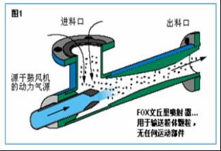 文丘里噴射器采用由鼓風機或者空壓縮機產生的正壓空氣流經噴射器時產生吸力,抽吸走位于噴射器上方的物料,并使之在正壓氣動輸送系統中輸送粉體、顆粒及散裝物料。在輸送過程中,文丘里噴射器推壓固體物料與空氣的混合物,由此提供足夠的壓力來彌補下流管道的壓力降。